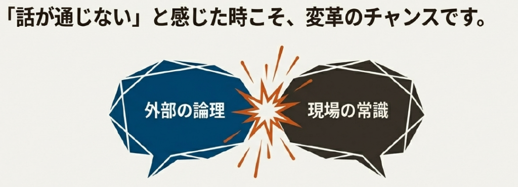「なんでそんなことを聞くんだ?」「その考え方はおかしい」と心がざわついた時、それは「自分たちの常識」と「外部の論理」が衝突している証拠です。「違和感」を排除せず、「なぜ彼らはそう考えるのか?」と一歩踏み込んで問い直すこと。それが、既存の枠組みを壊す変革の入り口となります。