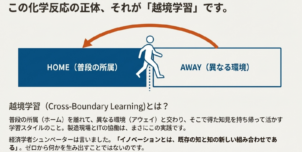 今、組織論や人材育成の分野で注目されているキーワードに「越境学習(Cross-Boundary Learning)」があります。普段の所属(ホーム)を離れて、異なる環境(アウェイ)と交わり、そこで得た知見を持ち帰って活かす学習スタイルのことです。製造現場とITの協働は、まさにこの「越境学習」の実践そのものです。