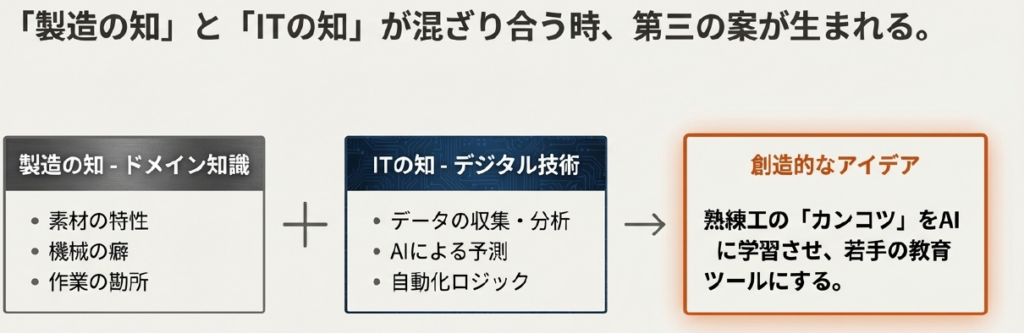 この2つが、それぞれの領域に閉じこもっていては何も起きません。しかし、両者が越境し、混ざり合うことで、「熟練工の『カンコツ』をAIに学習させ、若手の教育ツールにする」といった創造的なアイデアが生まれます。