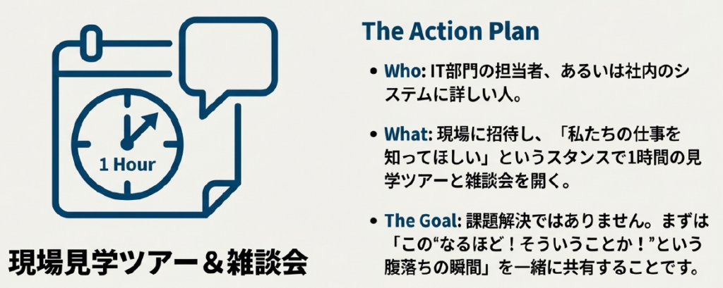 IT部門の担当者、あるいは社内のシステムに詳しい人を現場に招待し、「現場見学ツアー」と称した1時間の雑談会を開いてみてください。