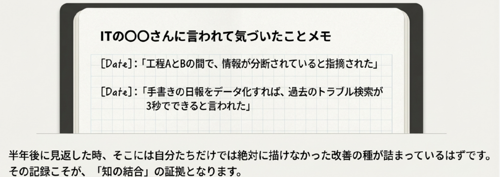 異質な視点との対話で得られた「気づき」は、その場限りのものにしてはいけません。すぐに消えてしまう儚いものです。「ITの〇〇さんに言われて気づいたことメモ」をノートや日報に残しましょう。