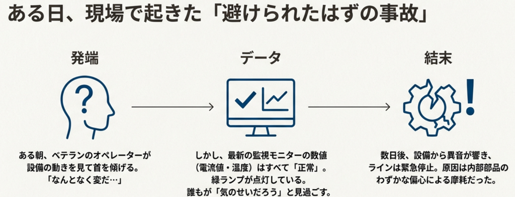 ある製造現場での出来事です。 その日の朝、ベテランのオペレーターがふと、設備の動きを見て首を傾げました。しかし、最新の監視モニターに表示された電流値や温度データはすべて「正常」の緑ランプ。 「気のせいだろう」と誰もがその小さなサインを見過ごしました。