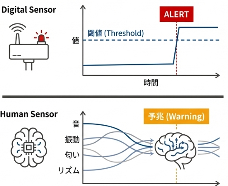 こうした複合的な情報は、デジタルのセンサーが「異常」と断定するずっと手前の、「異常の兆候(予兆)」の段階にあります。感性はデータよりも早く反応するセンサーであり、データに先行する「兆し」を捉えているのです。