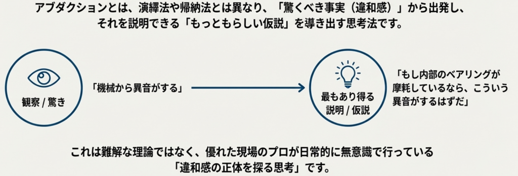 このように、例えば、「機械から異音がする(驚くべき事実)」という違和感に対し、 「もし内部のベアリングが摩耗しているなら、こういう異音がするはずだ(仮説)」 と要因に当たりをつけていく。こうした思考がアブダクション思考です。