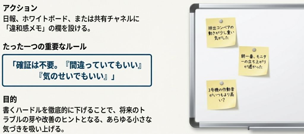 まず、日報やホワイトボードに「違和感メモ」の欄を設けましょう。 ここには、確定事項やトラブル報告だけでなく、「確証はないけれど気になったこと」を書かせます。