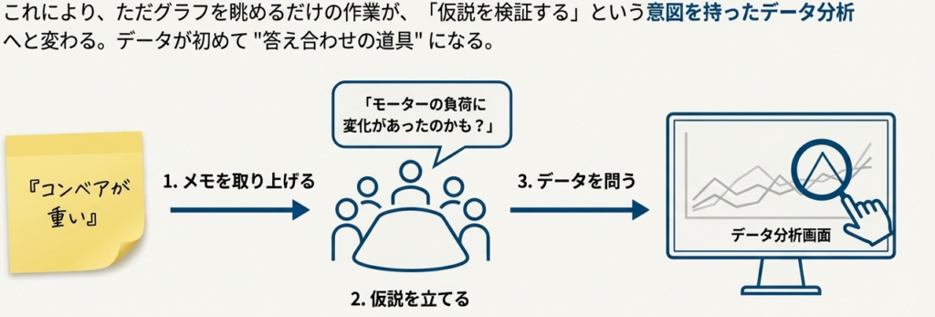 次に、集まった「違和感メモ」と、実際の稼働データを照らし合わせる時間を持ちます(週1回のミーティングなど)。 「『コンベアが重い』とメモがあった時間のモーター負荷率データを見てみよう」 そうしてデータを確認します。