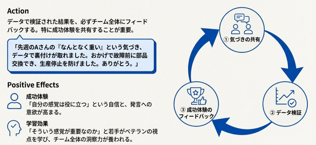 最後に、検証された結果をチーム全体にフィードバックします。 「先週のAさんの『なんとなく重い』という気づき、データで見たら実際に電流値が上がっていました。おかげで故障前に部品交換できました」