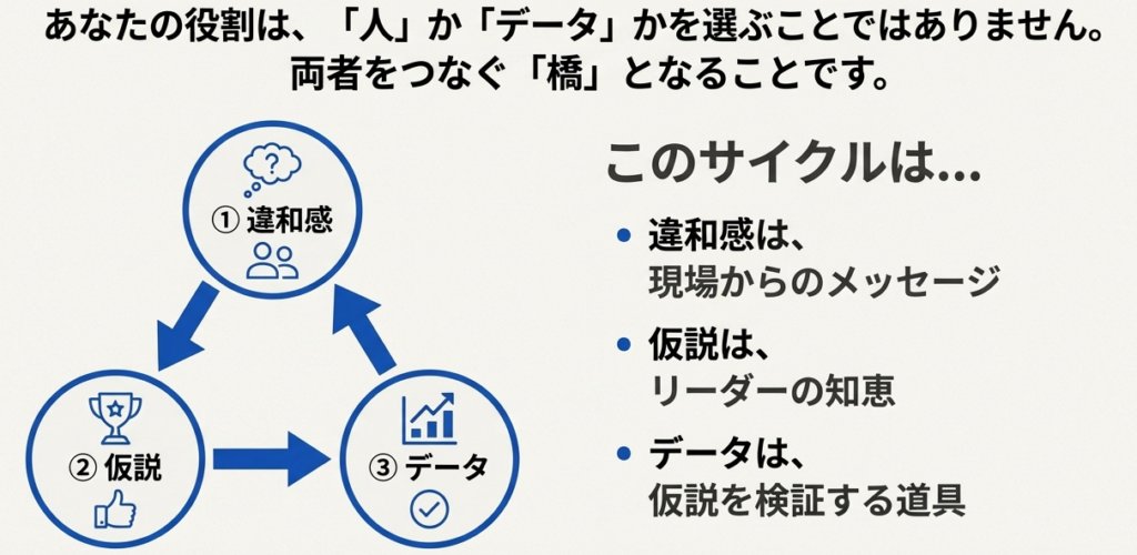違和感は現場からのメッセージ。仮説はリーダーの知恵。データは仮説を検証する道具になります。
